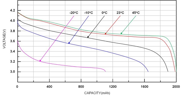 下圖顯示不同放電率下電壓與電池容量的關(guān)系。放電率愈高,電池容量愈低。溫度低時,電池容量也會降低。