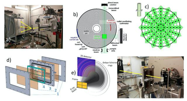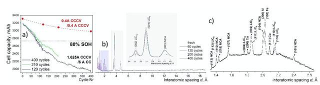 使用三只電池進行循環(huán),分別循環(huán)120次、210次和400次,該電池的初始容量為3170mAh,經(jīng)過120次循環(huán)后電池剩余容量為2528mAh,經(jīng)過210次循環(huán)后剩余容量為2346mAh,經(jīng)過400次后剩余容量為1950mAh,表明該電池循環(huán)性能較差,在經(jīng)過120次循環(huán)后電池容量就降低到了80%以下,這主要是受到作者采用的充放電電流比較大的影響。下圖b為新電池和循環(huán)老化后的電池的單頻中子衍射圖譜,從下圖b中能夠看到該圖譜主要是由NCA正極、石墨相1和相2,Al箔和Cu箔,以及18650電池的不銹鋼外殼構成。