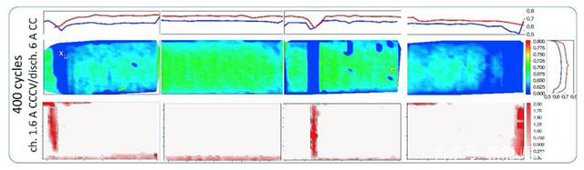 雖然上面的測試數(shù)據(jù)表明隨著循環(huán)次數(shù)的增加,Li在負極分布的均勻性持續(xù)降低,但是上述的測試結(jié)果分辨率仍然比較低,因此雖然從測試結(jié)果可以看到Li的濃度分布均勻性在降低,但是不同電池之間的差距并不大。為了獲得更高分辨率的Li分布圖像,作者降新電池和循環(huán)400次后的電池進行了解剖,將滿電負極取出,采用粉末衍射的方式對鋰的分布進行了檢測。下圖c展示了負極中Li的分布。從圖中能夠看到在新電池中除了受到正極部分區(qū)域沒有活性物質(zhì)的影響,負極相應位置的Li濃度比較低外,其余位置的負極中Li的分布比較均勻,但是在電極的寬度方向能夠看到上下邊緣的Li濃度稍低,這主要是受到在電極內(nèi)部電流分布的影響。