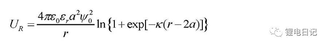 對于兩個具有相同尺寸、相同表面電勢的球形粒子,兩顆粒間產(chǎn)生的靜電排斥勢能(如圖11所示為靜電排斥勢能隨顆粒間距的變化)UR大小為: