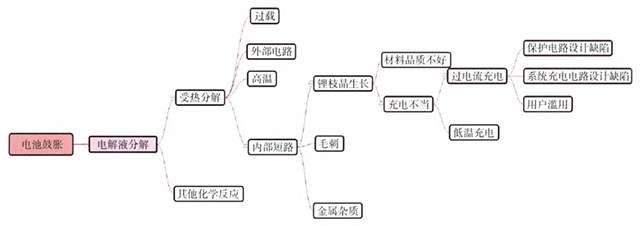 某鋰離子電池失效起鼓,首先可以分析,造成電池起鼓的直接原因是由于電解液的分解,在密封的電池內(nèi)部產(chǎn)生了氣體,造成電池鼓脹。造成電解液分解的原因有很多,所有可能的因素如圖4所示,顯然電解液受熱分解是最主要的可能原因。