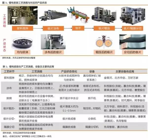 鋰電池生產(chǎn)過程復(fù)雜,主要生產(chǎn)過程主要包括電極生產(chǎn)的攪拌和涂覆階段(前階段)、電池單體合成的卷繞和注液階段(中間階段)以及化學(xué)包裝的包裝檢驗階段(后階段)。價值(購買金額)約占(35~40%):(30~35)%:(30~35)%。差異主要來自不同的設(shè)備供應(yīng)商、進(jìn)口/國產(chǎn)比例的差異等。流程基本相同,價值比例有偏差,但總體符合比例。