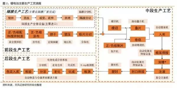 鋰電池生產(chǎn)前階段對應(yīng)的鋰設(shè)備主要有真空混合機(jī)、涂布機(jī)、輥壓機(jī)等;中間工序主要包括模切機(jī)、繞線機(jī)、層壓機(jī)、噴液機(jī)等。;后端流程包括化學(xué)成型機(jī)、體積檢測設(shè)備、流程倉儲和物流自動化等。此外,電池組生產(chǎn)需要電池組自動化設(shè)備。