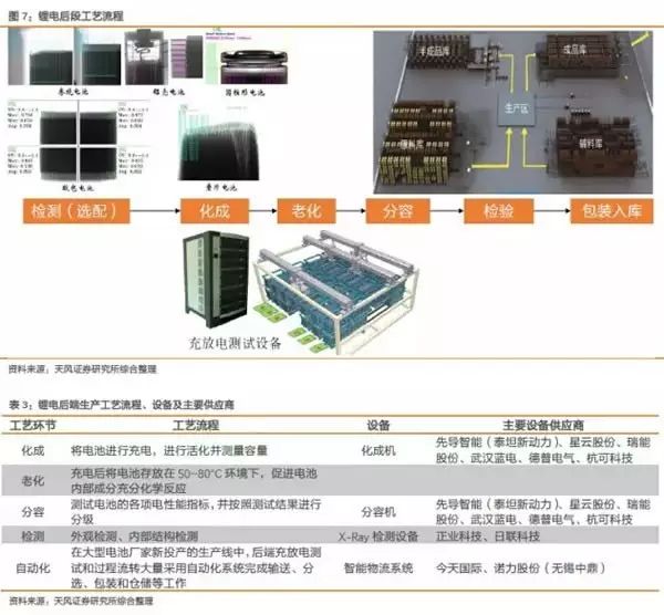 鋰電后段生產(chǎn)工藝主要為分容、化成、檢測和包裝入庫四道工序,占生產(chǎn)線價值量約35%。化成和分容作為后段工藝中最主要環(huán)節(jié),對成型的電池進(jìn)行激活檢測,由于電池的充放電測試周期長,因此設(shè)備的價值量最高?;晒に嚨闹饕饔迷谟趯⒆⒁悍庋b后的電芯充電進(jìn)行活化,分容工藝則是在電池活化后測試電池容量及其他電性能參數(shù)并進(jìn)行分級?;珊头秩莘謩e由化成機(jī)和分容機(jī)通常由自動化分容化成系統(tǒng)完成。